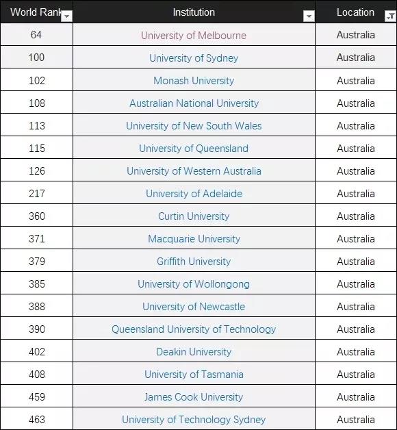 总览澳洲大学表现,墨尔本大学和悉尼大学跻身前100,莫纳什大学排在第102名,澳洲国立大学排在第108名。在本次排名中总共有18所澳洲院校入围世界500强,表现不凡。